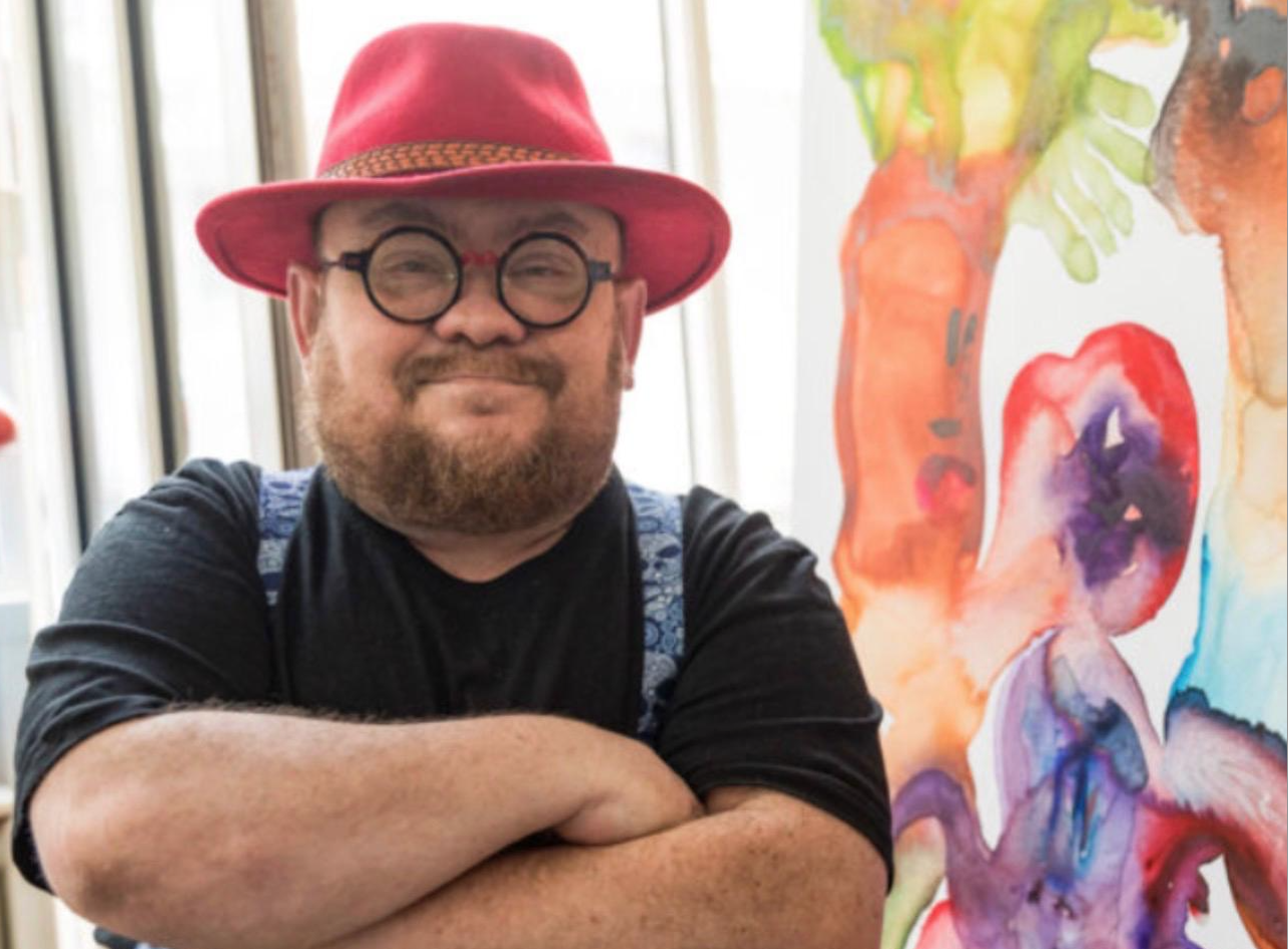 Né en 1975, formé aux Beaux-Arts de Paris et de Nantes, le peintre aura, pendant plus de vingt ans, façonné une œuvre singulière, libre de toute assignation. Chez lui, les références se croisent sans hiérarchie : imagerie médiévale, culture populaire, bande dessinée, psychanalyse, fantasmagories enfantines. Tout devient langage. Tout devient matière. Et au cœur de ce théâtre intérieur, il y a lui — démultiplié, travesti, exposé.